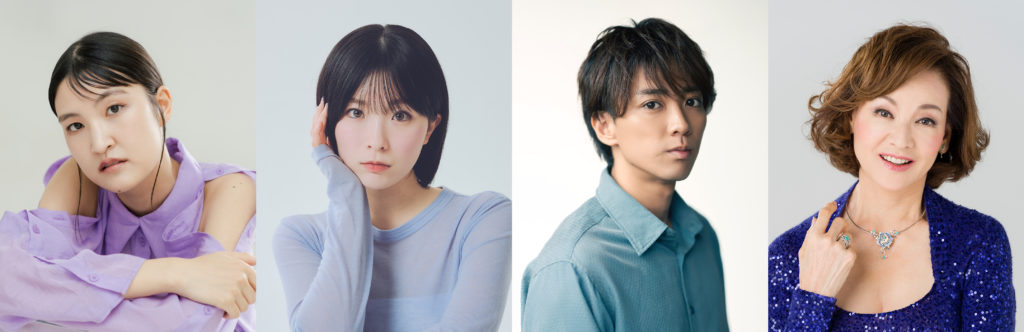 左から順に、小原芽衣役:吉岡優希、坂本茉由役:久留栖るな、白井和也役:河下楽、天宮栄子役:夏樹陽子